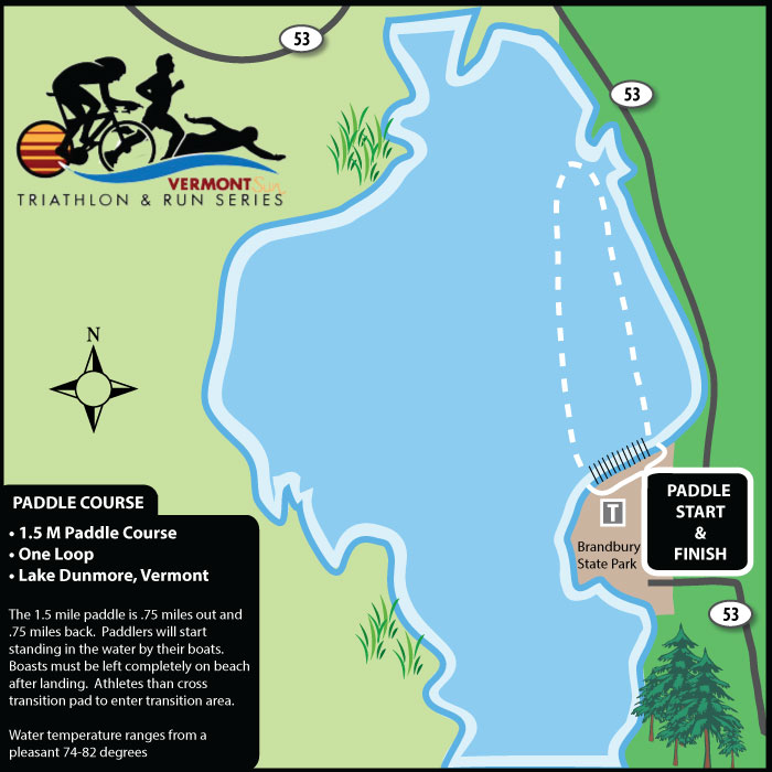 The 1.5 mile paddle is .75 miles out and .75 miles back. Paddlers will start standing in the water by their boats. Boasts must be left completely on beach after landing. Athletes than cross transition pad to enter transition area.